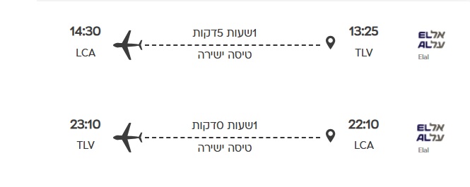 יציאה: מתל אביב יום שישי, אלעל 5133, המראה 13:25, נחיתה 14:30