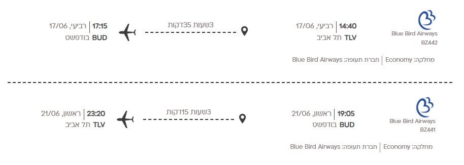 טיסה ישירה: תל אביב – בודפשט – תל אביב עם בלו בירד.